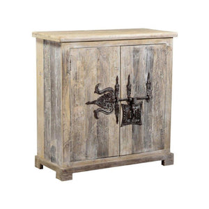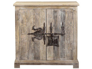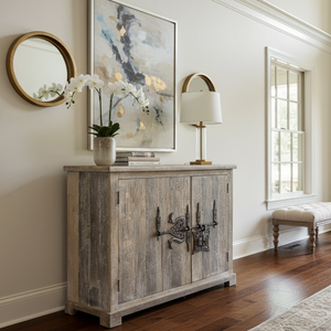 Bring a touch of rustic elegance to your dining or living area with this handcrafted sideboard. Featuring beautifully distressed wood and ornate metal accents, this piece offers both style and functionality with ample storage behind its detailed doors. Perfect for storing dinnerware, linens, or other essentials, this sideboard combines old-world charm with practical design, making it a standout addition to any home.