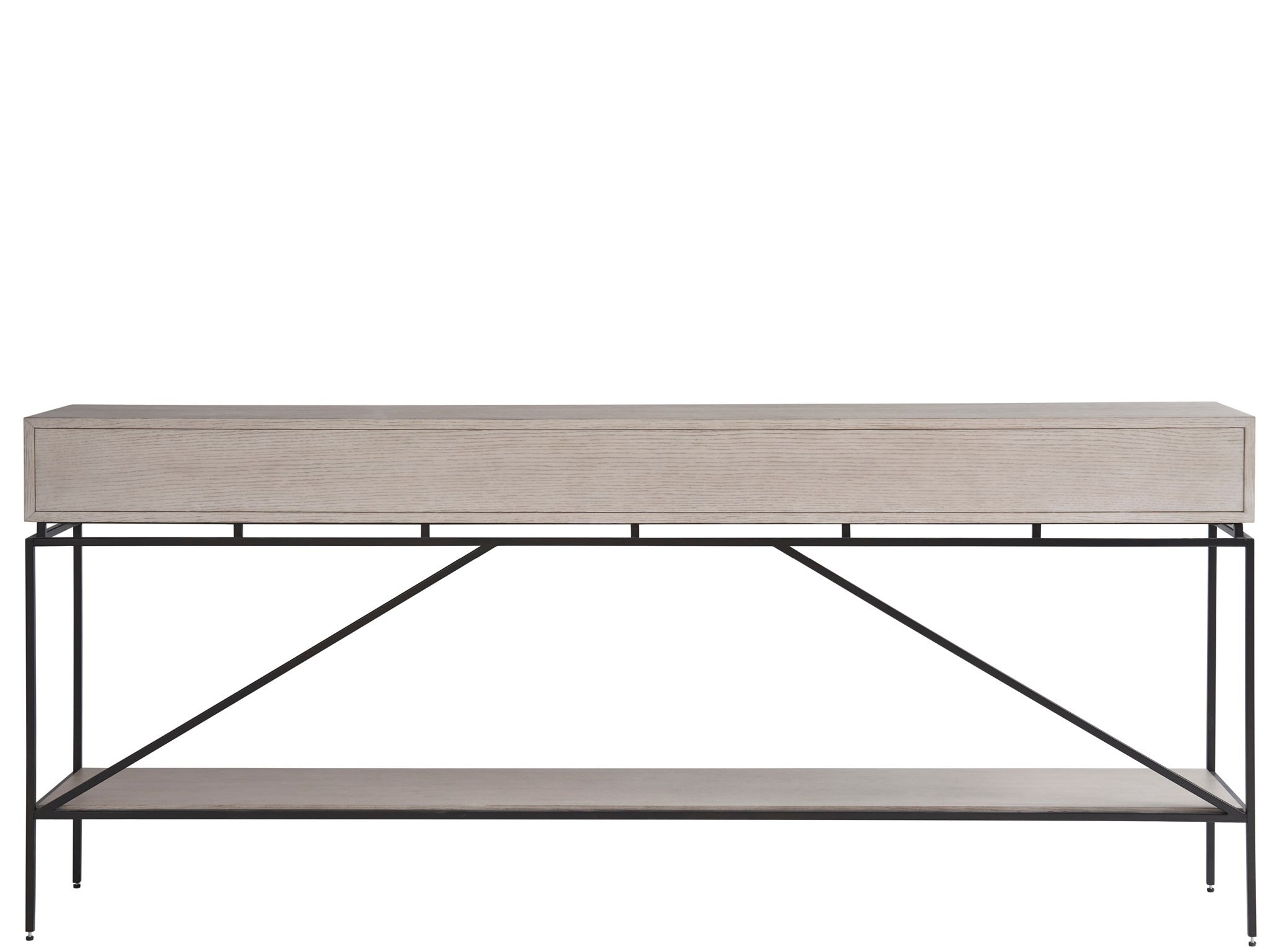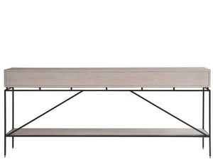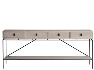 The Fog & Oak Console stands with poise in its Rolling Fog finish, its form punctuated by striking metal hardware. Metal legs and detailing infuse the piece with a dynamic interest, while its clean lines introduce a crisp, contemporary twist.
