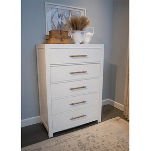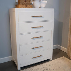 The Hilton Head 5-Drawer Chest combines coastal aesthetics with refined craftsmanship. Constructed from select hardwoods and pine veneers, this piece features driftwood drawer fronts that evoke a relaxed, beachside sensibility while maintaining a clean, modern silhouette. Five spacious drawers showcase dovetail joinery and smooth ball-bearing extension guides for reliable performance. The top drawer includes a felt-lined bottom for delicate items, the bottom drawer features cedar veneer for natural fragrance, and remaining drawers are fully veneered. Framed end panels and custom-designed hardware elevate its functionality and visual appeal. A dust panel beneath the bottom drawers provides additional protection.