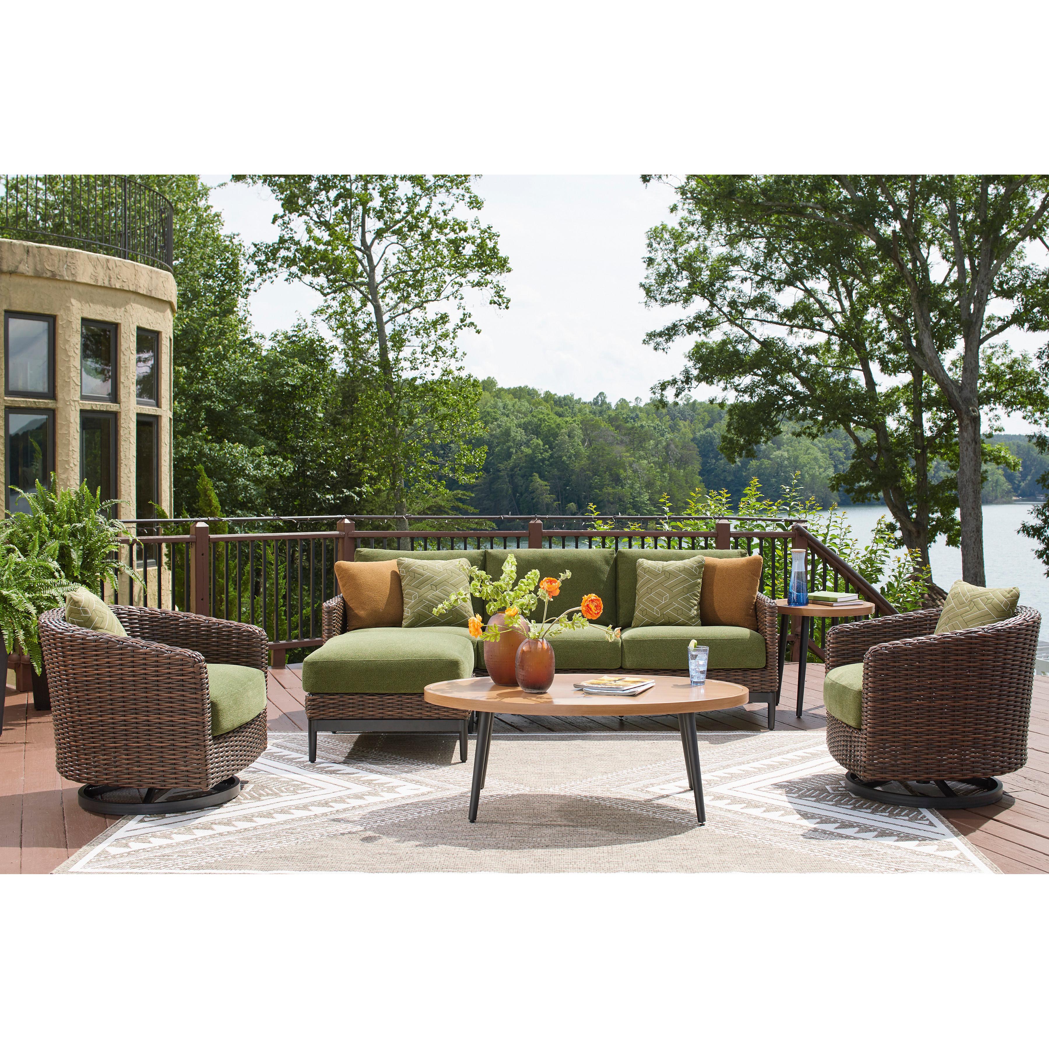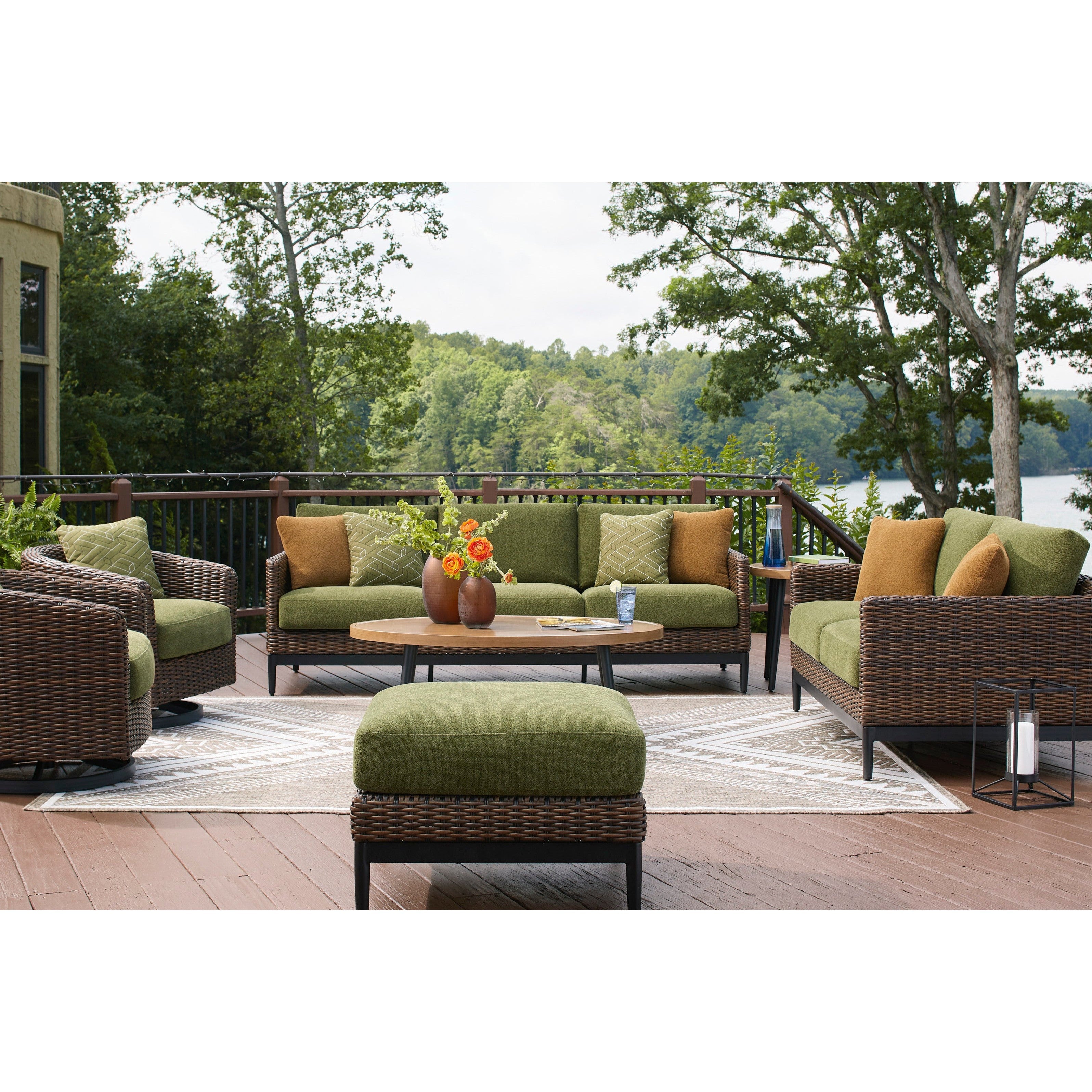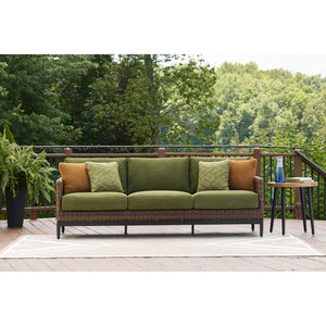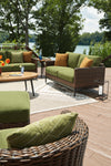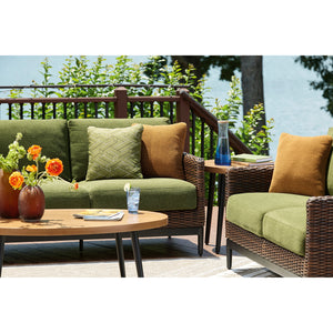 A centerpiece of outdoor comfort and style. This luxurious outdoor design brings the comfort of your living room to your patio, deck, or garden, blending seamlessly with the beauty of the outdoors. This collection recalls the aesthetics of nature to bring an inviting, high-style feel to your patio  performance fabric is made with enhanced UV resistance, so the chic green hue stays brighter for longer. Worried about the weather? Don't sweat it—the durable resin wicker withstands the elements from season to season.
