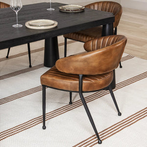 Seat family and friends in style with this handsome chair featuring a black iron frame finished with top grain leather upholstery. Tapered legs, a curved back, and channel tufting blend modern and retro elements into stunning, sophisticated look.