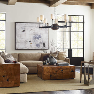Expertly crafted from natural teak, our stunning Teak Coffee Table features a unique arrangement of caramel-toned squares that create a visually striking design. The recessed black wood base gives the table a modern and sleek appearance, while the natural fissures and variations in grain add to its one-of-a-kind charm. A true statement piece for any living space.