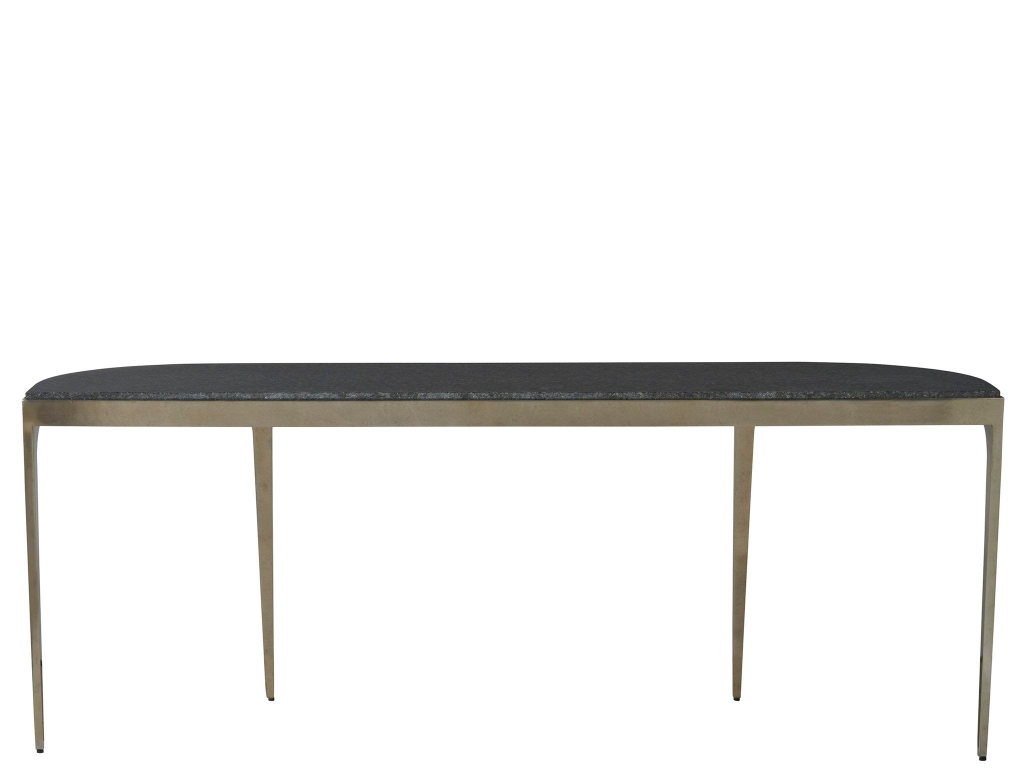 The Black Granite & Bronze Console Table presents a sleek Black Granite surface, harmoniously coupled with a luminous Champagne Aluminum base. Its slim, graceful legs contribute to an aura of finesse, offering a distinguished and polished touch to contemporary spaces with its elegant blend of textures.