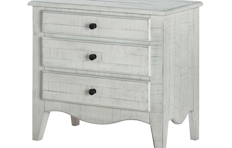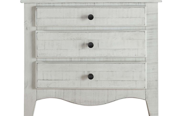 Bring some rustic, cottage charm into your bedroom with this nightstand. The piece boasts a distressed and textured White Wash finish that pairs beautifully with the oil rubbed bronze knob drawer pulls. Furthermore, the scalloped edges of the base add some elegant movement to the piece. As storage goes, you receive two spacious drawers.