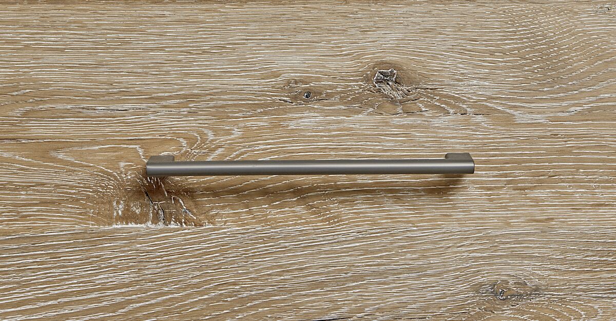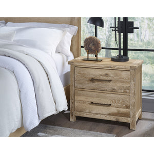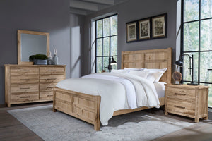 Vaughan Bassett has developed a patent-pending process that allows them to accelerate how wood ages. We have kept the splits; knots; cracks; and the bold grain pattern found in Oak lumber to create this reclaimed look in this beautiful and unique bedroom