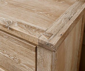 The Dovetail Bedroom Collection is proudly Made in the USA by over 500 craftsmen and craftswomen in our factories in the Virginia mountains. The collection features Solid White American Oak solids and white oak veneers. By using ATAP™ (Accelerate The Aging Process) technology, we have kept the splits, cracks, knots and the bold grain pattern found in oak lumber to create a reclaimed wood look in this beautiful and unique bedroom collection. This collection is made exclusively for consumers who understand and value a reclaimed wood look. The dominant design feature is the dovetail, a wood joinery technique dating back thousands of years and which we display prominently near the top of each bed post, the front right and front left top rim of each case piece, and in all four comers of each mirror. Until now, only Mother Nature could make wood look this good. The Dovetail Bedroom Collection by Vaughan-Bassett comes in four fantastic finishes - Java, Mystic Grey, Natural Oak, and Sun Bleached White.