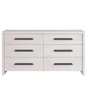 Crafted in a light and airy Dwell Glacier finish, the Six Drawer Dresser blends natural texture with clean, modern lines. Its framed drawer fronts and sleek hardware create a sophisticated storage solution, perfect for adding both functionality and a touch of architectural detail to your bedroom.