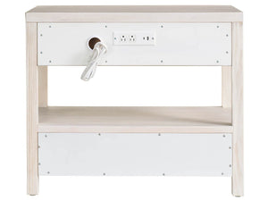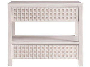 The Dwell Glacier Nightstand showcases the collection's architectural inspiration with its distinct latticework detailing, finished in a light and airy Dwell Glacier. This piece offers both open and drawer storage, combining functionality with a touch of sophisticated design. Its unique texture and clean lines bring a refined, yet natural aesthetic to your bedside.
