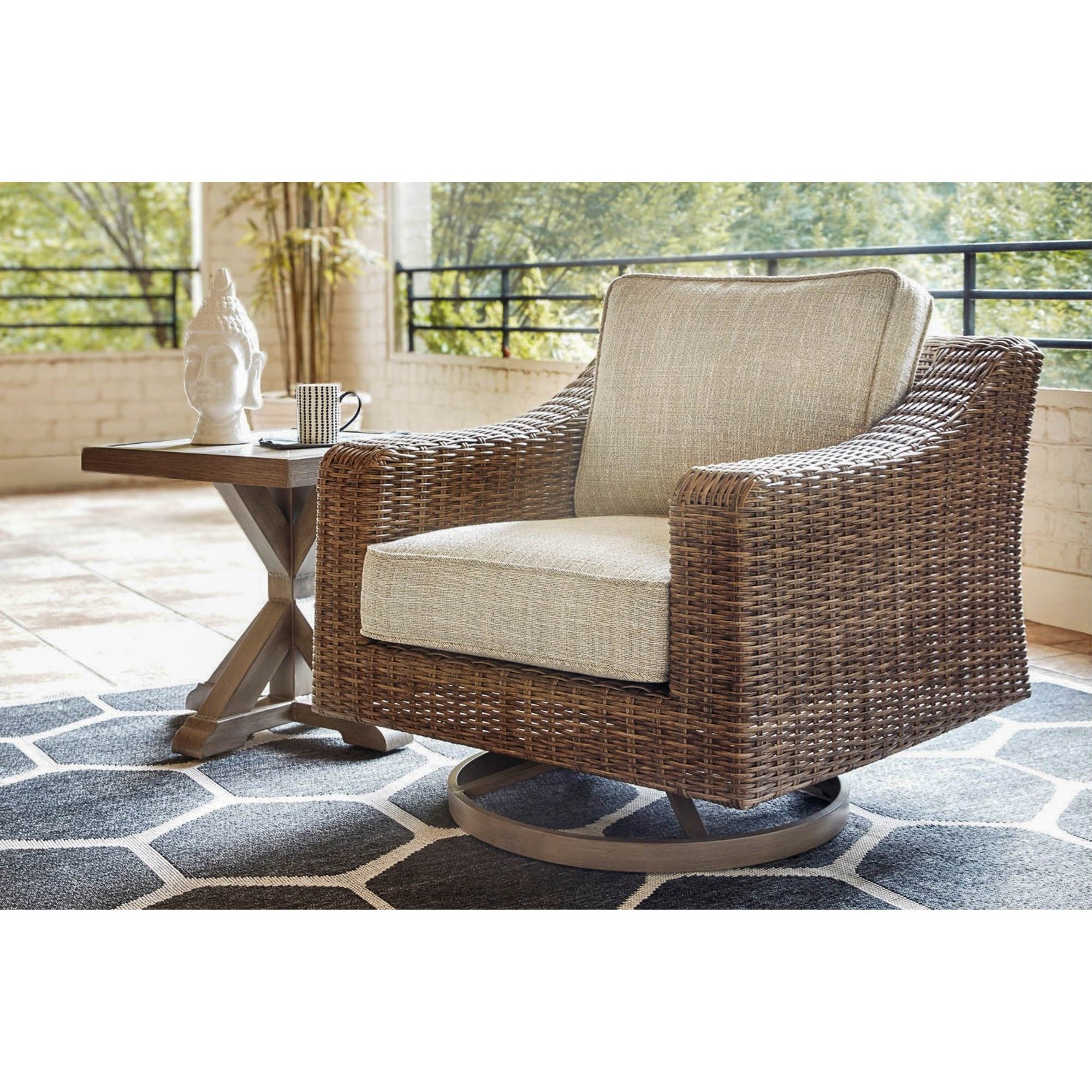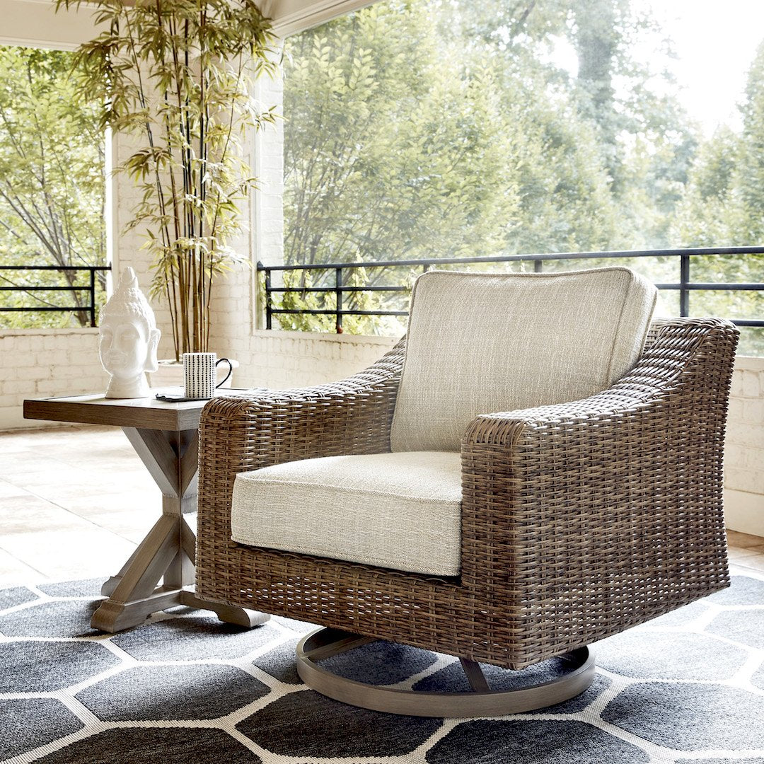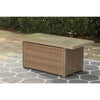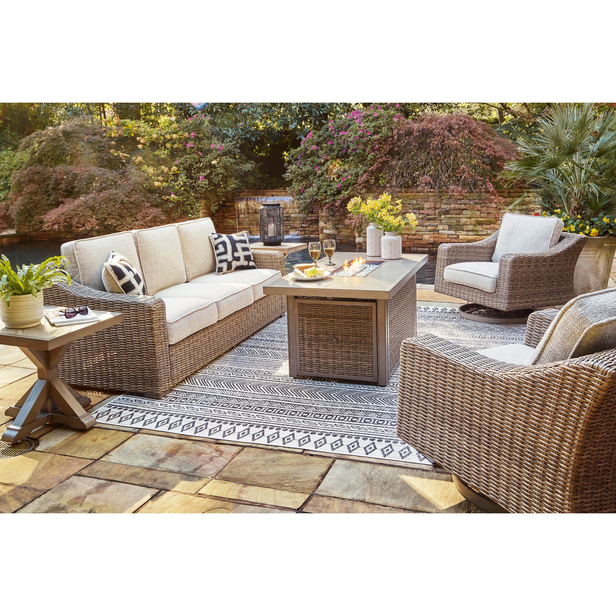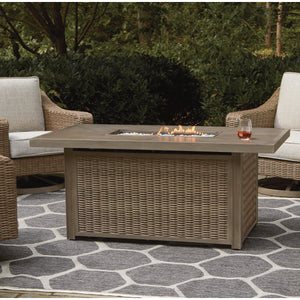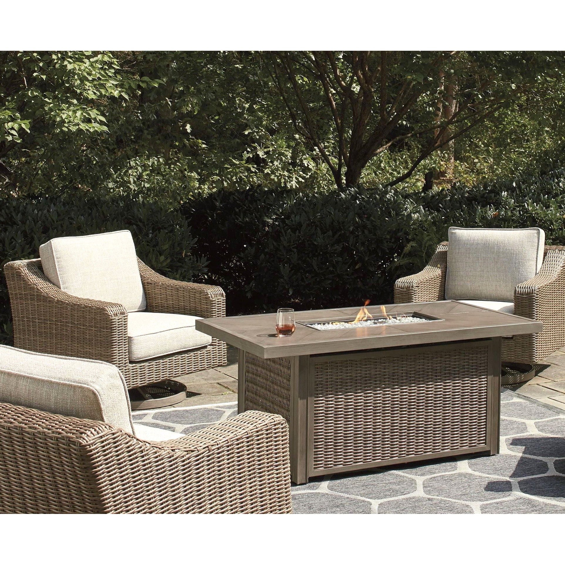 The firepits chic chevron-patterned top is paired with all-weather resin wicker over rust-proof aluminum for beauty and brawn. Stainless steel burner with glass beads adds a captivating element sure to wow.
