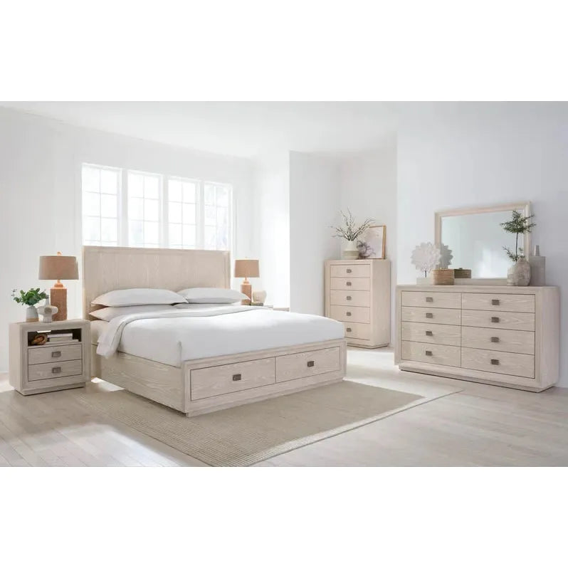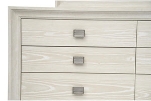 This classic contemporary collection blends a crisp modern silhouette with traditional picture frame moldings and jewel-like, custom molded metal pulls. Made from a mix of quartered and flat cut Ash wood veneer and meranti solid wood, our proprietary Sugar finish showcases the wood's active grain with a beige base and a soft white powder glaze resting on top.