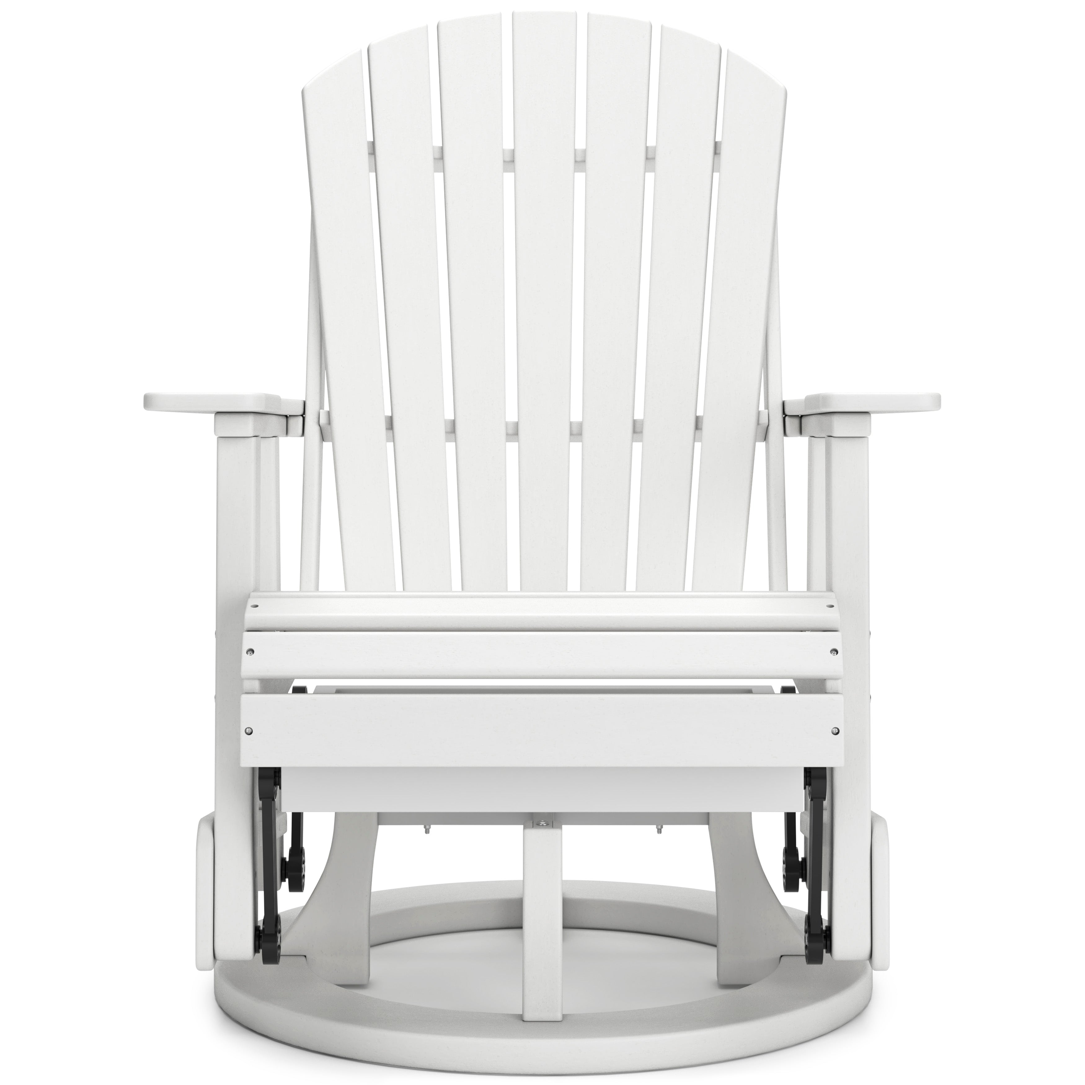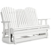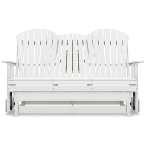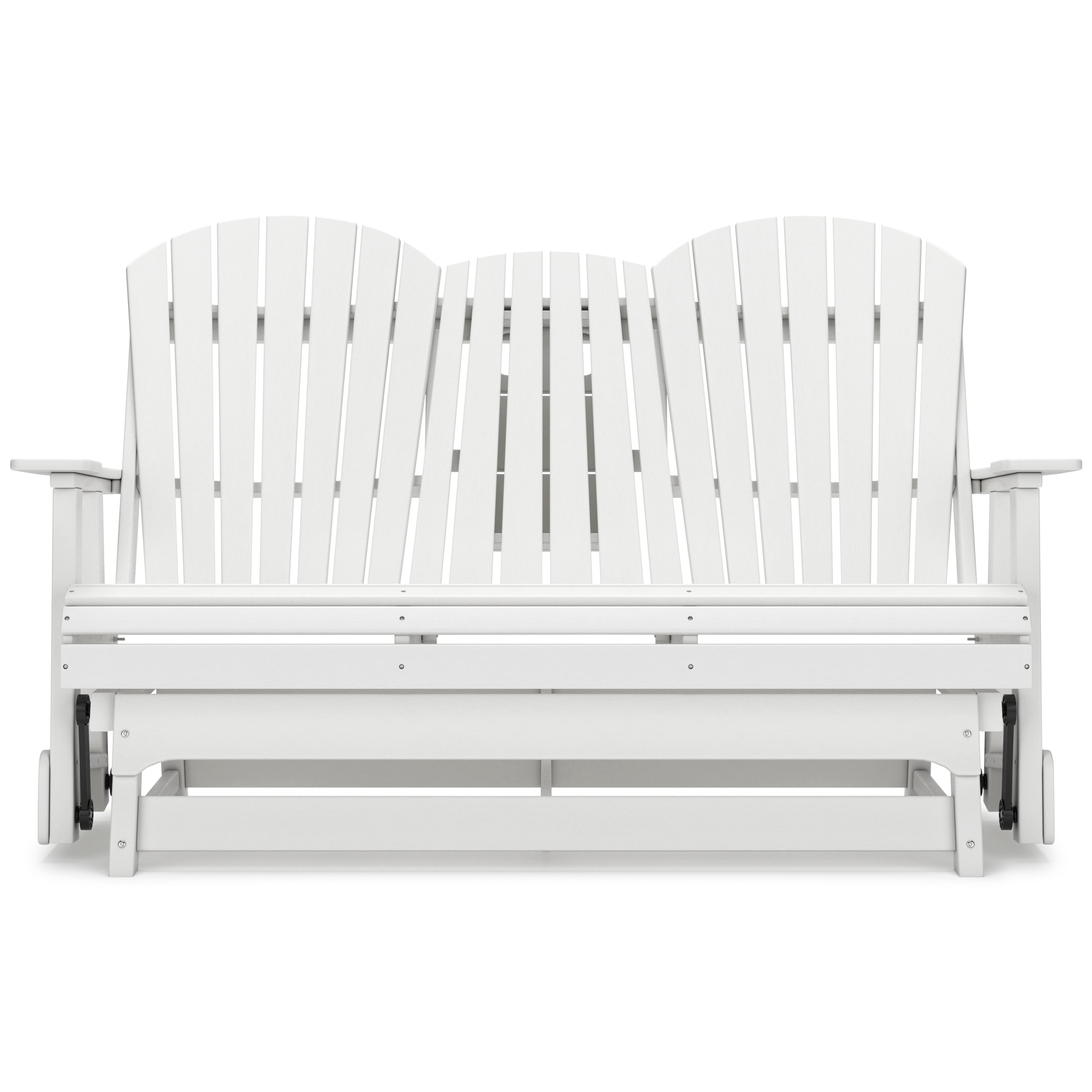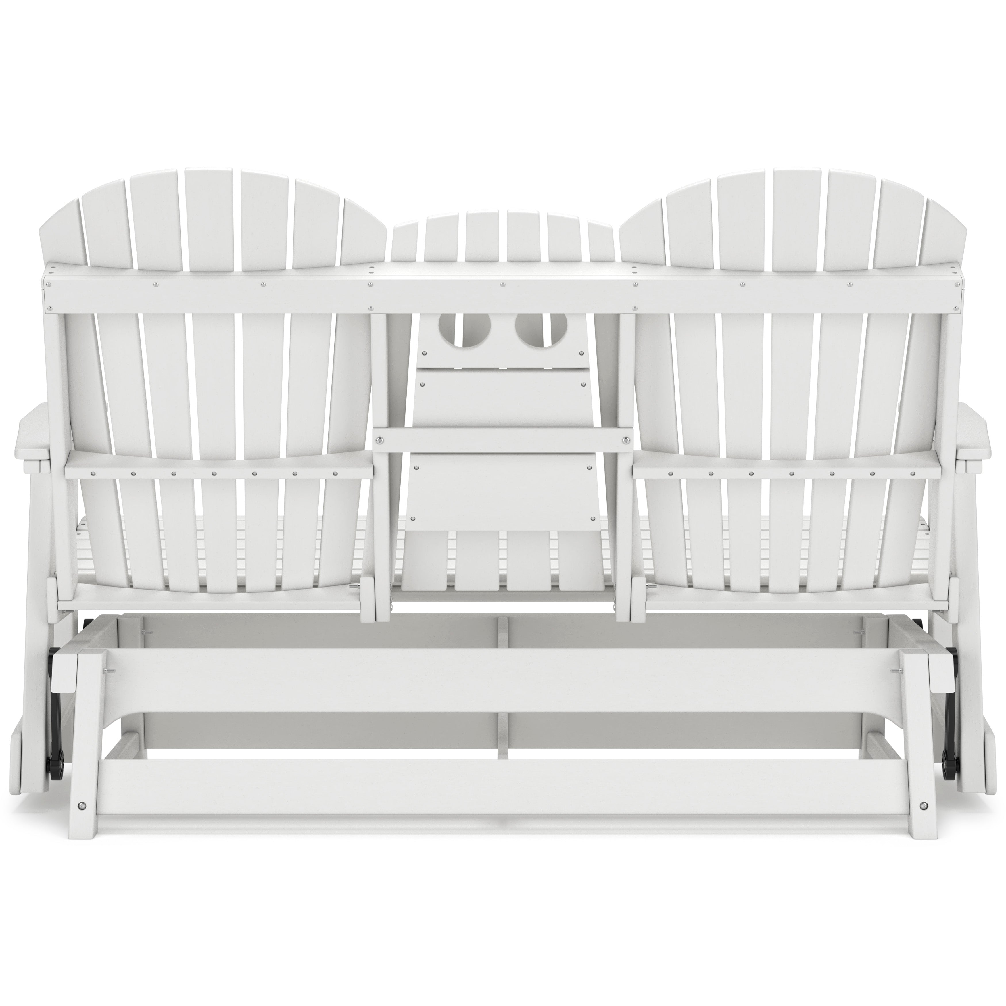 Drift away from everyday worries and into outdoor bliss with this glider loveseat. Dressed in summery white, the Adirondack-inspired design has a classic feel. It weathers sunny summer days and cozy winter nights with durable MEGA TUFF™ HDPE material. A drop-down console with integrated cup holders keeps refreshments and snacks within easy reach. With the console snapped into the back, this loveseat has even more room for enjoying lazy days in the shade.
