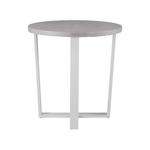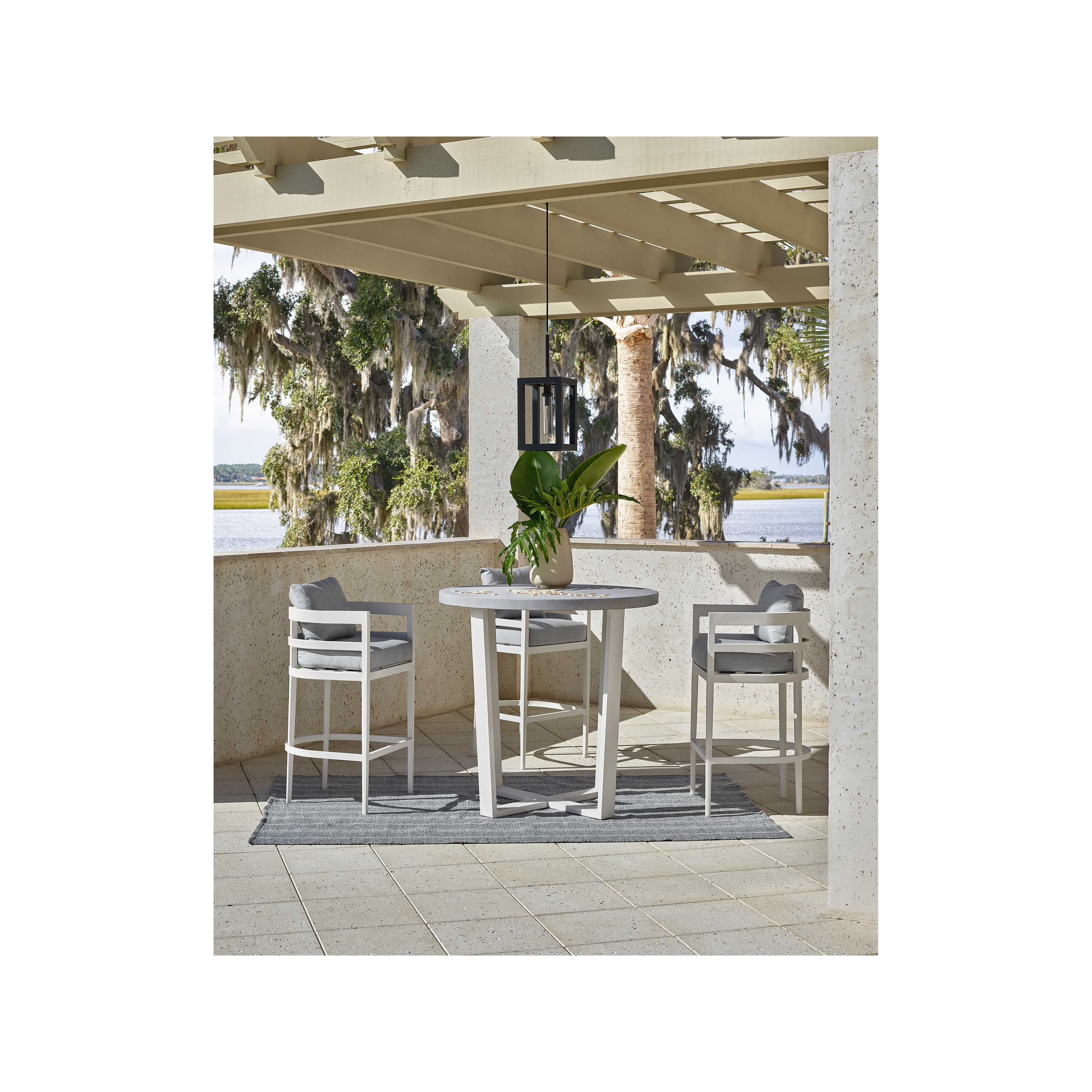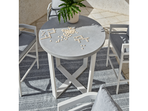 A white aluminum base supports a rounded cast concrete top in the South Beach Bar Table, a casually cool accent piece perfect for a variety of outdoor design styles.