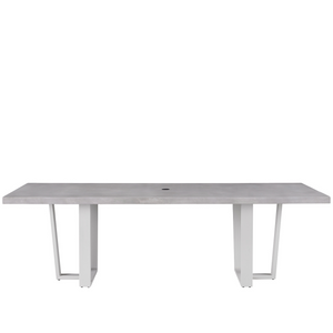A large cast concrete top is accentuated by a sleek metal base in the South Beach Dining Table, a breezy statement piece with a modern silhouette.
