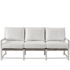 Modern with a touch of coastal flair, the Tybee Sofa includes greige wicker detailing, a crisp white frame, and plush upholstered cushions. Durable construction meets gorgeous design with this outdoor seating made to withstand the elements for years to come. The comfort seat cushions contain a 1.8 density Antimicrobial foam to keep our cushions from developing mold or mildew. Each cushion is wrapped in a 2oz dacron fiber wrap to provide additional comfort. Our seat cushions as well as back and throw pillow are sonic seals on the edges and bagged in a water-resistant ticking to keep moisture out. Combined with the water-resistant properties found in our outdoor performance fabric offering, the Coastal Living outdoor cushions will perform great in the rain or with a wet swimsuit. This ultimately provides indoor living room comfort for your outdoor living space.